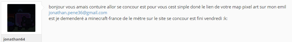 Le forum de Minecraft-France va définitivement fermer ses portes. Celui-ci restera en lecture seule mais vous ne pourrez plus y apporter de nouveaux topics. Nous vous invitons à nous rejoindre sur le Discord de Minecraft-France qui permet de présenter vos projets, discuter avec la communauté etc.. Merci à tous d'avoir fait vivre ce forum de nombreuses années. Pour nous rejoindre sur Discord, Cliquez ici