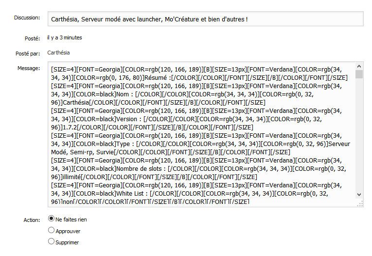 Le forum de Minecraft-France va définitivement fermer ses portes. Celui-ci restera en lecture seule mais vous ne pourrez plus y apporter de nouveaux topics. Nous vous invitons à nous rejoindre sur le Discord de Minecraft-France qui permet de présenter vos projets, discuter avec la communauté etc.. Merci à tous d'avoir fait vivre ce forum de nombreuses années. Pour nous rejoindre sur Discord, Cliquez ici