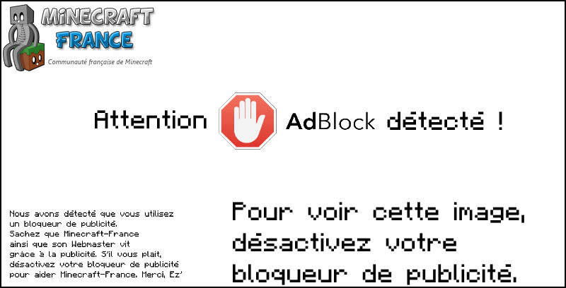 Le forum de Minecraft-France va définitivement fermer ses portes. Celui-ci restera en lecture seule mais vous ne pourrez plus y apporter de nouveaux topics. Nous vous invitons à nous rejoindre sur le Discord de Minecraft-France qui permet de présenter vos projets, discuter avec la communauté etc.. Merci à tous d'avoir fait vivre ce forum de nombreuses années. Pour nous rejoindre sur Discord, Cliquez ici