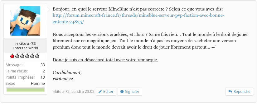 Le forum de Minecraft-France va définitivement fermer ses portes. Celui-ci restera en lecture seule mais vous ne pourrez plus y apporter de nouveaux topics. Nous vous invitons à nous rejoindre sur le Discord de Minecraft-France qui permet de présenter vos projets, discuter avec la communauté etc.. Merci à tous d'avoir fait vivre ce forum de nombreuses années. Pour nous rejoindre sur Discord, Cliquez ici
