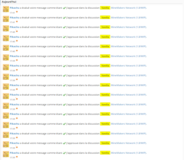 Le forum de Minecraft-France va définitivement fermer ses portes. Celui-ci restera en lecture seule mais vous ne pourrez plus y apporter de nouveaux topics. Nous vous invitons à nous rejoindre sur le Discord de Minecraft-France qui permet de présenter vos projets, discuter avec la communauté etc.. Merci à tous d'avoir fait vivre ce forum de nombreuses années. Pour nous rejoindre sur Discord, Cliquez ici