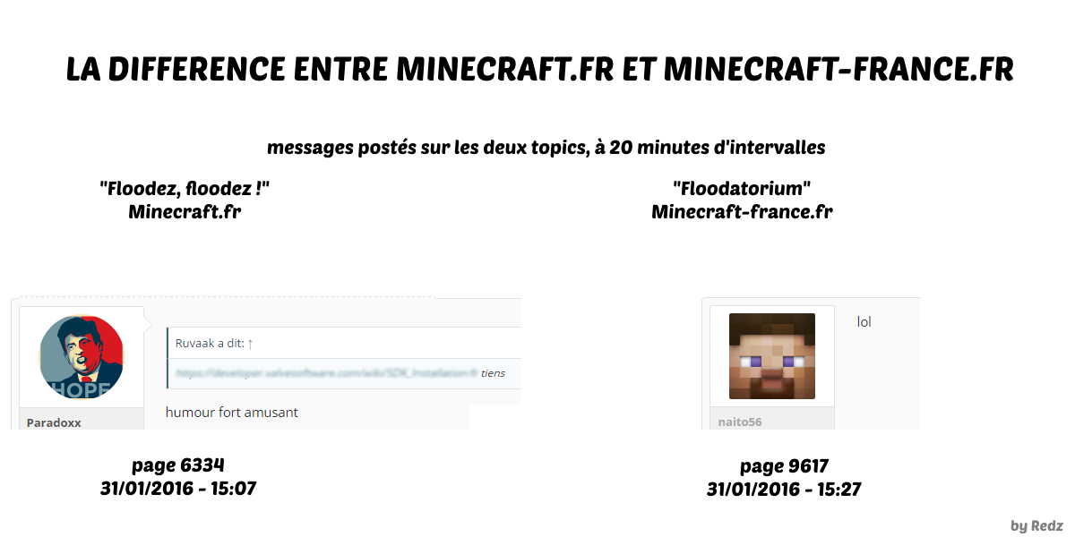 Le forum de Minecraft-France va définitivement fermer ses portes. Celui-ci restera en lecture seule mais vous ne pourrez plus y apporter de nouveaux topics. Nous vous invitons à nous rejoindre sur le Discord de Minecraft-France qui permet de présenter vos projets, discuter avec la communauté etc.. Merci à tous d'avoir fait vivre ce forum de nombreuses années. Pour nous rejoindre sur Discord, Cliquez ici