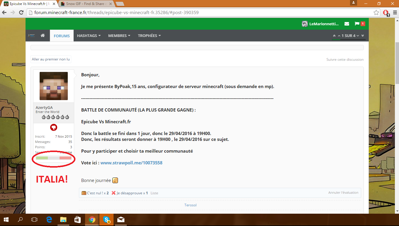 1. Le forum de Minecraft-France va définitivement fermer ses portes. Celui-ci restera en lecture seule mais vous ne pourrez plus y apporter de nouveaux topics. Nous vous invitons à nous rejoindre sur le Discord de Minecraft-France qui permet de présenter vos projets, discuter avec la communauté etc.. Merci à tous d'avoir fait vivre ce forum de nombreuses années. Pour nous rejoindre sur Discord, Cliquez ici