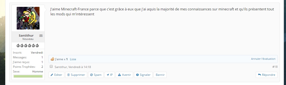 Le forum de Minecraft-France va définitivement fermer ses portes. Celui-ci restera en lecture seule mais vous ne pourrez plus y apporter de nouveaux topics. Nous vous invitons à nous rejoindre sur le Discord de Minecraft-France qui permet de présenter vos projets, discuter avec la communauté etc.. Merci à tous d'avoir fait vivre ce forum de nombreuses années. Pour nous rejoindre sur Discord, Cliquez ici